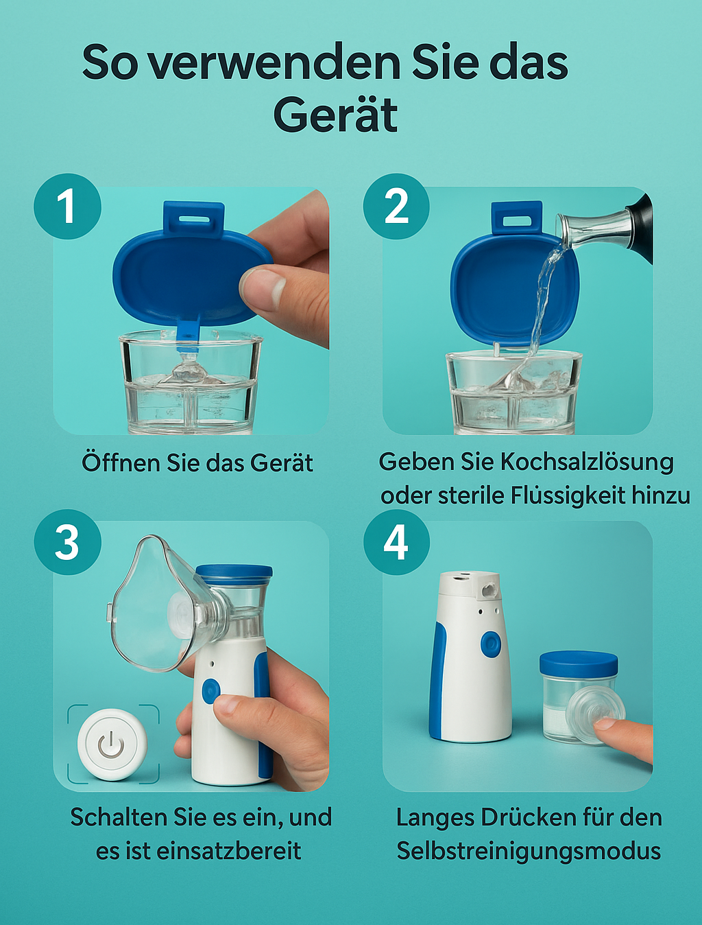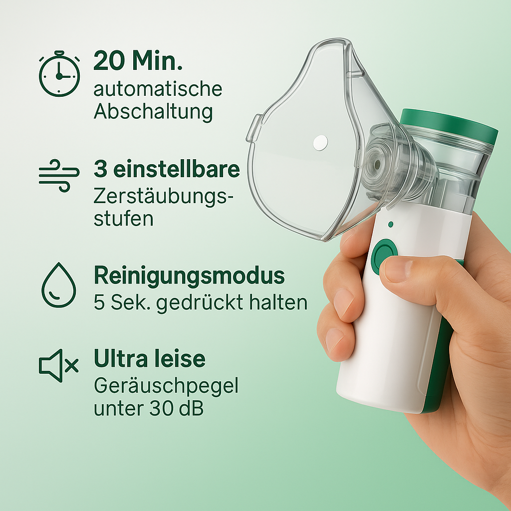 Leise, tragbar und einfach zu bedienen – ideal für jedes Kind, das eine Inhalation braucht. Es macht die Behandlung entspannter und verbessert die Lebensqualität.