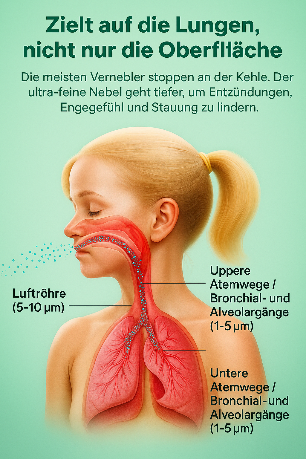 Ultrafeiner Nebel beruhigt die Atemwege und verringert pfeifende Geräusche.